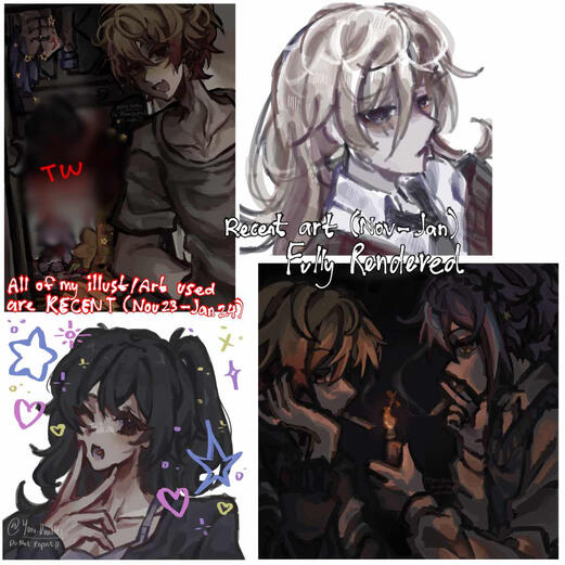 - Please make sure to give clear reference, the more specific (like poses, bg reference and characters) the better :3